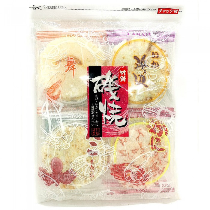 【商品成分】落花生,糯米粉,糯玉米澱粉,小麥粉,砂糖,米,蠶豆,豌豆,醬油(含小麥,大豆),食鹽,棕櫚油,海苔,鯷魚,蝦粉,咖哩粉(陳皮,薑黃,葫蘆巴,芫荽,馬芹,紅辣椒),芝麻,糊精,香辛料(紅辣椒,山葵),辣椒,鰹魚萃取物,石蓴,味醂,糊化澱粉,香料,調味劑(胺基乙酸,L-麩酸鈉,5’-次黃嘌呤核?磷酸二鈉, 5’-鳥嘌呤核?磷酸二鈉,琥珀酸一鈉,琥珀酸二鈉,琥珀酸),食用色素(食用紅色6號,食用藍色1號,食用藍色2號,食用黃色4號,食用黃色5號,普通焦糖色素,紅椒色素,紅麴色素),甜味劑(甘草萃).(原材料一部份含有大豆)