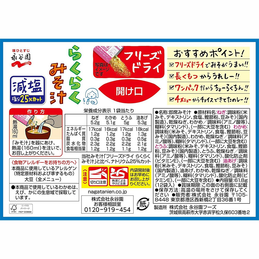 「青蔥」「海帶芽」「豆腐」「油豆皮」四種口味組合的粉末味噌湯。只要沖入熱水就能立刻溶解,非常適合忙碌時的早餐或搭配便當享用。這款減鹽配方可滿足健康需求(與「凍乾 即食味噌湯」相比,減少25%的鹽分)。